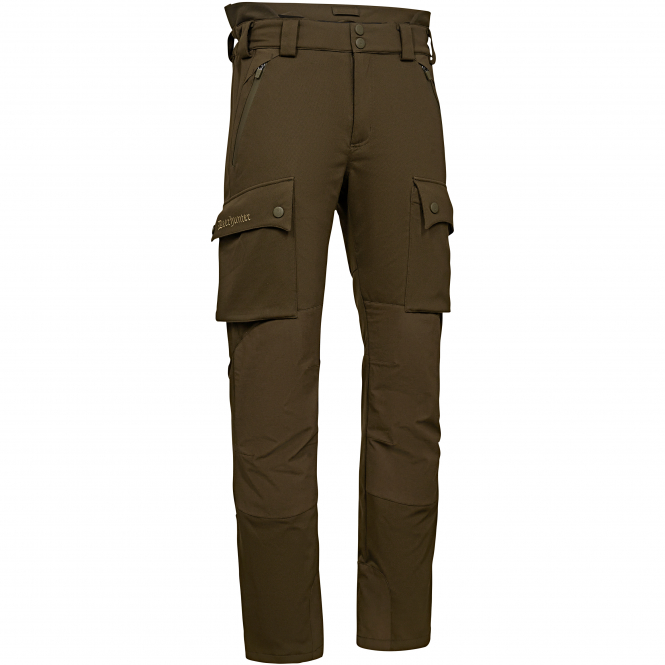 Die Muflon Pro Hose von Deerhunter ist für höchste Ansprüche bei Outdoor-Aktivitäten und der Jagd konzipiert. Sie bietet eine Vielzahl durchdachter Details, die Komfort, Schutz und Funktionalität miteinander verbinden. Die Hose verfügt über eine verstellbare Taille mit seitlichem Gummizug und einer erhöhten Rückenpartie für optimalen Sitz. Abnehmbare Hosenträger und ein Silikonband in der Taille sorgen dafür, dass die Hose auch bei Bewegung sicher an Ort und Stelle bleibt. Mit zwei Vordertaschen, die mit wasserdichten Reißverschlüssen ausgestattet sind, sowie zwei geräumigen Oberschenkeltaschen mit Patte bietet die Muflon Pro Hose viel Platz für Ausrüstung. Eine versteckte Messertasche an der linken Oberschenkeltasche ermöglicht einen schnellen Zugriff auf wichtige Werkzeuge. Belüftungsschlitze an den Beinen sorgen für ein angenehmes Klima, während vorgeformte Knie und verstärkte Bereiche an Knie und Unterschenkel die Haltbarkeit erhöhen. Die verdeckten Reißverschlüsse und Druckknöpfe am Unterschenkel sowie das wasserdichte Futter an den Unterschenkeln bieten zusätzlichen Schutz bei widrigen Bedingungen.